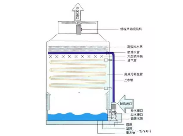 蒸發(fā)式冷凝器是利用盤管外的噴淋水部分蒸發(fā)時吸收盤管內(nèi) 高溫氣態(tài)制冷劑的熱量而使管內(nèi)的制冷劑逐漸由氣態(tài)被冷卻為液態(tài)。 蒸發(fā)式冷凝器是由冷卻管組、填料、淋水器、軸流風(fēng)機、集水槽、水泵、收水器、箱體等部件組成。
