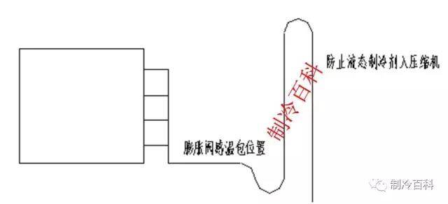 2、當吸氣上升管和蒸發(fā)器相連時,中間應(yīng)留有一段水平管和截留彎,勇于安裝感溫包;防止膨脹閥產(chǎn)生誤動作。