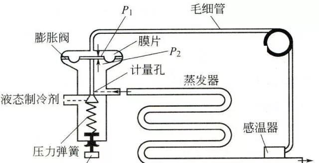 a.對高壓液態(tài)制冷劑進(jìn)行節(jié)流降壓,保證冷凝器和蒸發(fā)器之間的壓力差,以使蒸發(fā)器中的液態(tài)制冷劑在要求的低壓下蒸發(fā)吸熱,從而達(dá)到制冷降溫的目的;同時使冷凝器中的氣態(tài)制冷劑,在各頂?shù)母邏合路艧崂淠?/span>